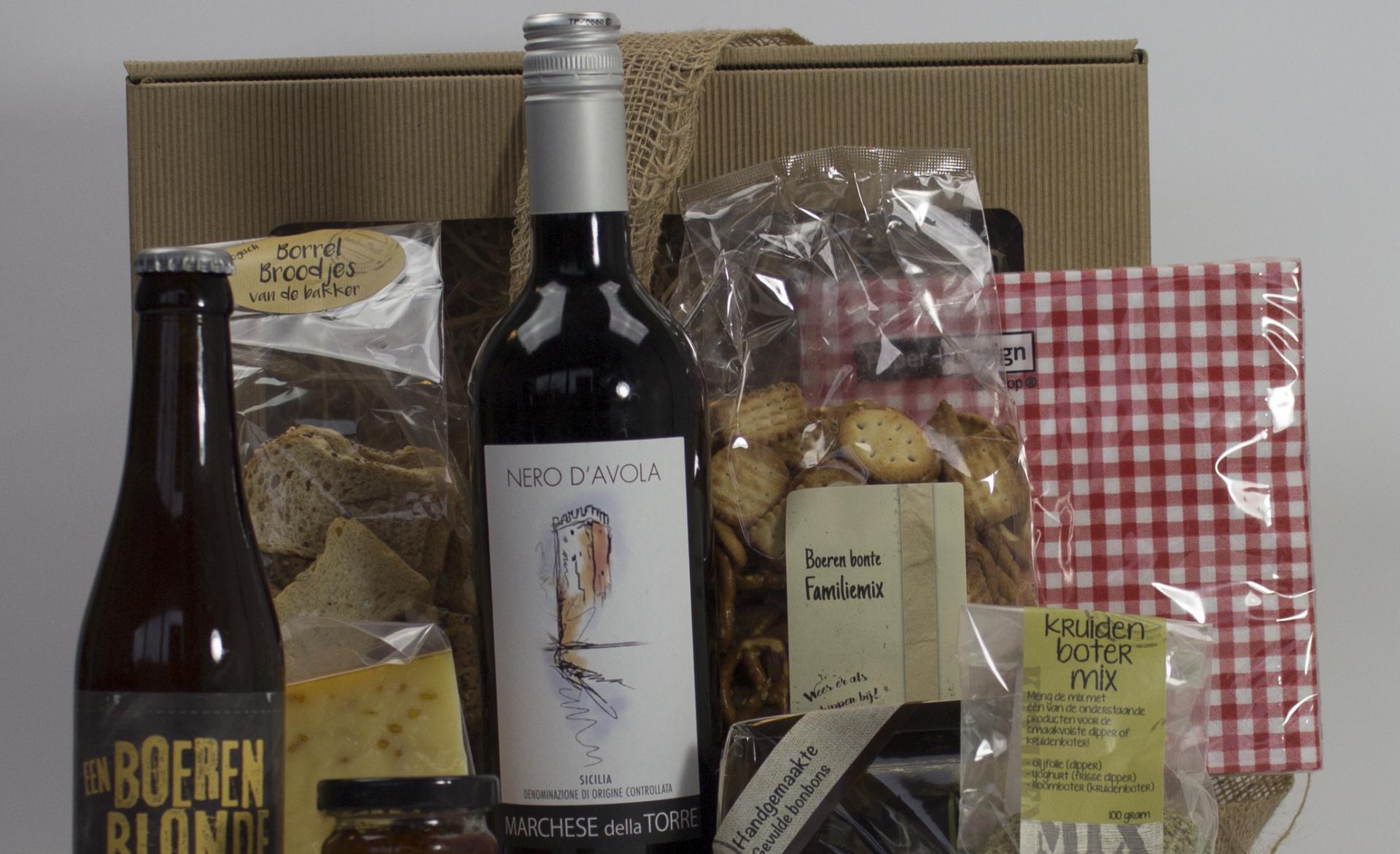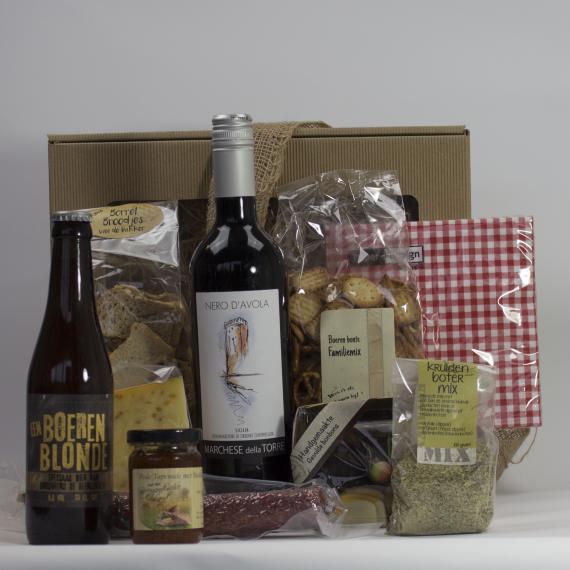 Deze box zit vol met lekkers voor het hele gezin. Kaas, worst, bonbons, een biertje, boerenservetten en een uitdeelzak familiemix. Iedereen mag meegenieten